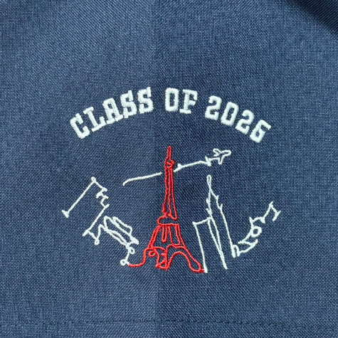 背中へ大きい3色イラスト刺繍、右袖へ手書き感を活かした2色イラスト刺繍、左袖へネーム刺繍