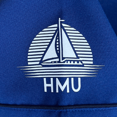 ブルーネイビーの爽やかな生地に、ヨットのロゴがパキッと映えて、